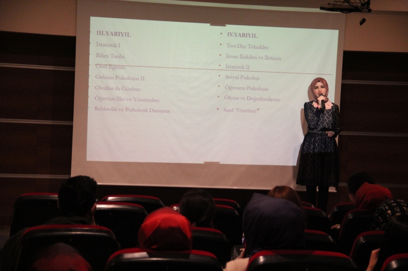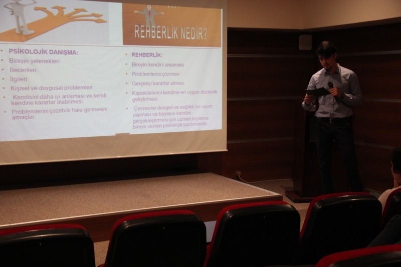 İçeriğini bölüm öğrencilerinin hazırladığı ve sunuculuğunu yine bölüm öğrencilerinden Kübra Nur Işık, Hümeyra Saraç ve İsmail Buğra Bebek’in yaptığı seminerde Rehberlik ve Psikolojik Danışmanlık Bölümü’nün genel anlamda mesleki tanıtımı yapıldı.